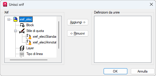 Sposta nell'elenco Definizioni da unire le definizioni dell'oggetto con nome selezionate nell'elenco Xrif.