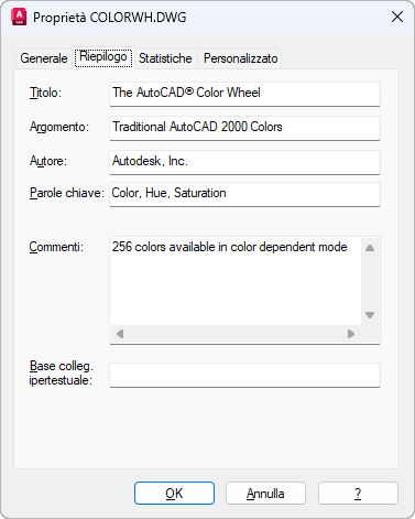 Specifica l'autore del disegno. Il nome dell'autore può essere digitato o modificato solo dall'utente. Per modificare il nome dell'autore, eliminare quello esistente e immettere un nuovo nome.