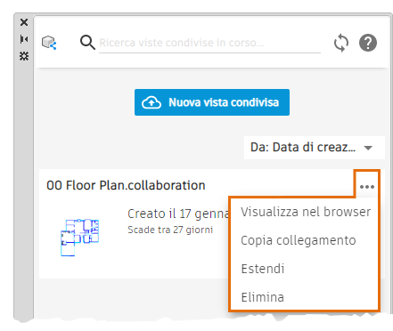 Avvia il processo di creazione di una nuova vista condivisa. Visualizza la finestra di dialogo Condividi vista offrendo diverse opzioni. Quindi, i dati vengono estratti dal disegno per creare una vista e questa vista viene temporaneamente pubblicata in un percorso nell'account Autodesk Web & Mobile; viene generato un collegamento a tale posizione, che è possibile condividere.