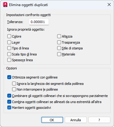 Utilizzare queste impostazioni per stabilire in che modo ELIMINADUPLICATI tratterà le linee, gli archi e le polilinee.