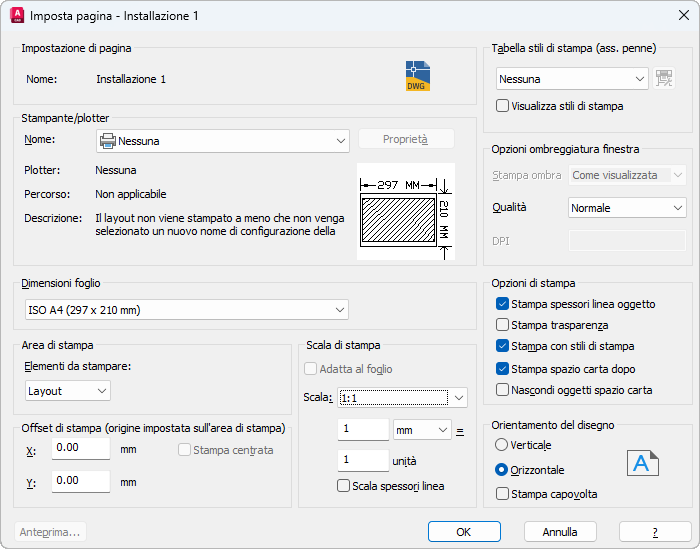 Specifica le opzioni per spessori di linea, trasparenza, stili di stampa, stampe ombreggiate e l'ordine di stampa degli oggetti.