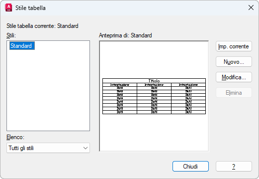 Elimina lo stile di tabella selezionato nell'elenco degli stili. Non è possibile eliminare uno stile utilizzato nel disegno.