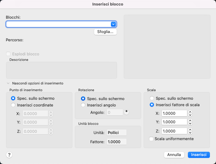 Specifica il nome e la posizione del blocco o del disegno da inserire.