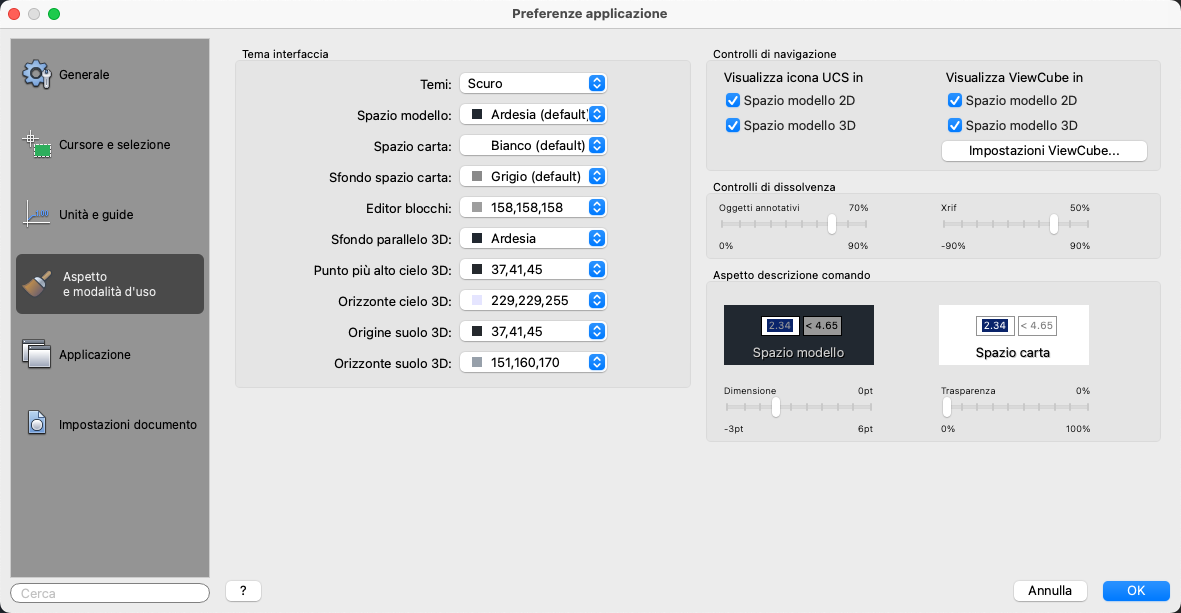 Controlla il tema da applicare agli elementi quali la barra di stato, tavolozze e le finestre di disegno. È possibile scegliere un tema Chiaro o Scuro.