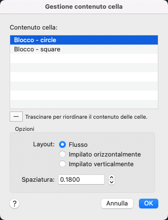 Selezionare Gestione contenuto cella dal visor Cella tabella per eliminare un blocco da una cella o per gestire più blocchi all'interno di una cella.