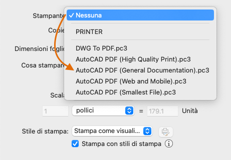 Dall'elenco a discesa Stampante/plotter, scegliere AutoCAD PDF (General Documentation).pc3: