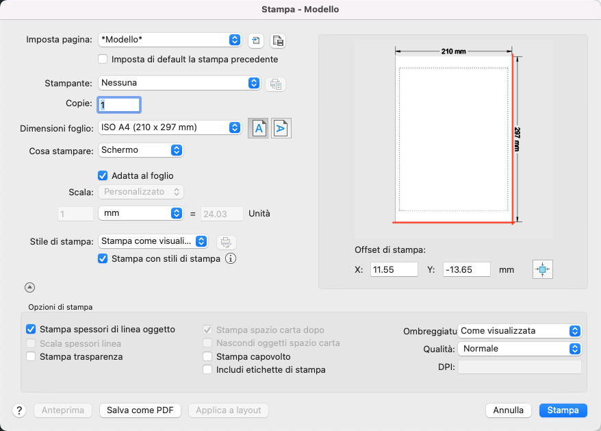 Per praticità, è possibile salvare e ripristinare gruppi di queste impostazioni in base al nome. Questi gruppi sono detti impostazioni di pagina. Mediante le impostazioni di pagina è possibile memorizzare le impostazioni necessarie per diverse stampanti, per la stampa in scala di grigi, per la creazione di un file PDF da un disegno e così via.
