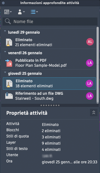 Informazioni approfondite attività fornisce una panoramica delle azioni eseguite in precedenza sui disegni dall'utente o da altri utenti.