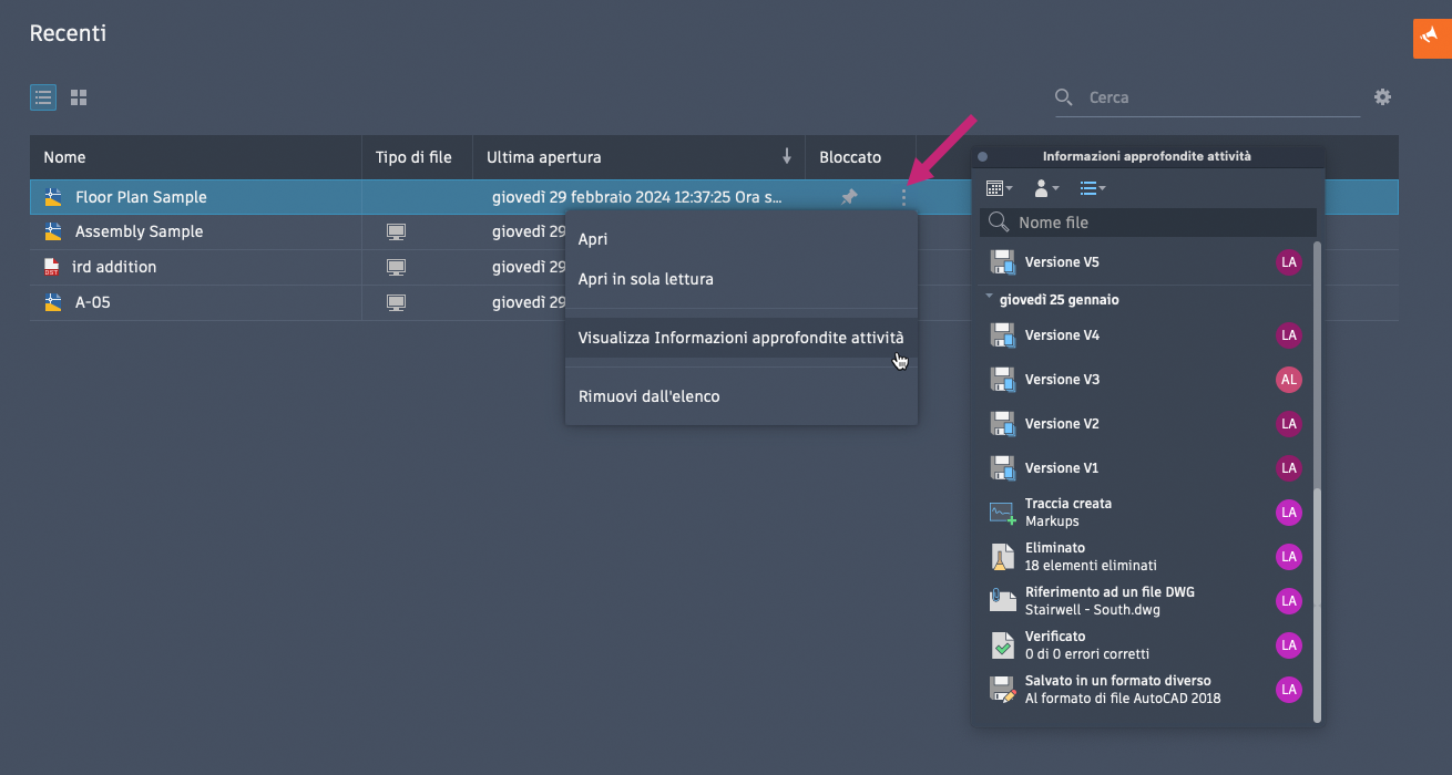 È inoltre possibile visualizzare le attività di un disegno senza dover aprire il file. Nella scheda Inizio, fare clic su Recente e selezionare il disegno. Quindi, fare clic sui puntini di sospensione verticali e selezionare Visualizza Informazioni approfondite attività in AutoCAD o Visualizza cronologia disegni in AutoCAD LT per visualizzare le attività del disegno nella tavolozza.
