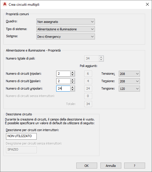 - Quadro: se è stato selezionato il nome di un quadro prima di avviare il comando, questo campo è disattivato. Se è stato selezionato <Non assegnato>, selezionare un quadro dall'elenco a discesa. Selezionare <Non assegnato> in questo elenco se non si desidera ancora assegnare il circuito ad un quadro.