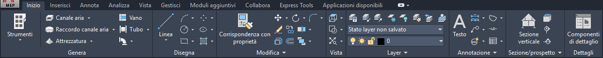 La barra multifunzione rappresenta la posizione centrale per accedere ai comandi di AutoCAD MEP 2025 toolset. È organizzata in schede corrispondenti alle attività più frequenti del processo di disegno. Sono disponibili due tipi di schede: