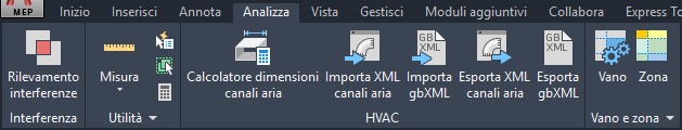 - HVAC. Fornisce uno strumento di calcolo delle dimensioni del canale aria e un metodo di importazione dei dati DuctXML e gbXML.