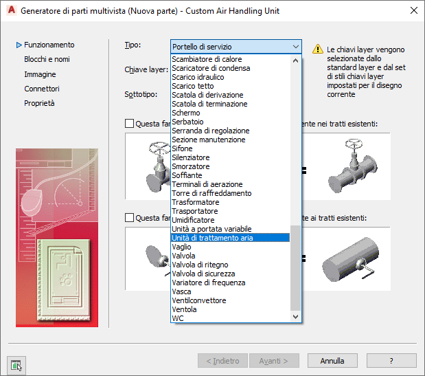 Il tipo di parte fa riferimento alla categoria principale della famiglia di parti e definisce caratteristiche e funzionamento univoci per le dimensioni parte, ad esempio la capacità di assegnare un'annotazione di flusso ad una dimensione parte HVAC. I tipi sono predefiniti nell'applicazione e non possono essere modificati, pertanto è necessario selezionare un tipo simile alle dimensioni parte.