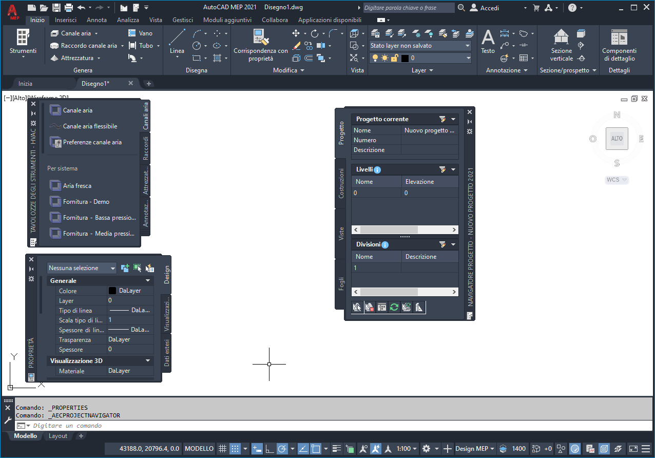 L'area di lavoro è costituita da una finestra di disegno con barra multifunzione, tavolozze degli strumenti e altri controlli utilizzabili per configurare progetti di impianti meccanici, elettrici o idraulici, creare il design e generare documenti di costruzione.
