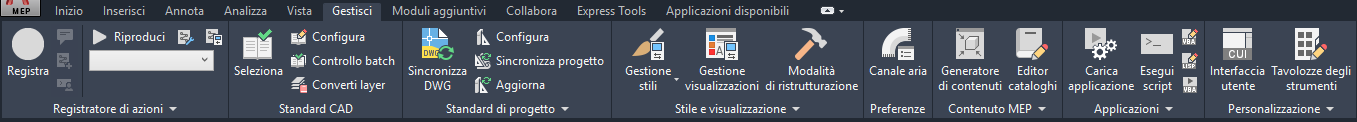 Nella scheda Gestisci sono disponibili funzionalità per utenti avanzati e amministratori CAD.