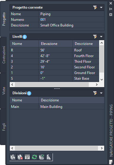 Il Navigatore progetto consente di centralizzare attività specifiche per il progetto quali la definizione dei livelli e delle divisioni dell'edificio (ali) nonché la creazione di disegni di progetto e fogli di stampa.