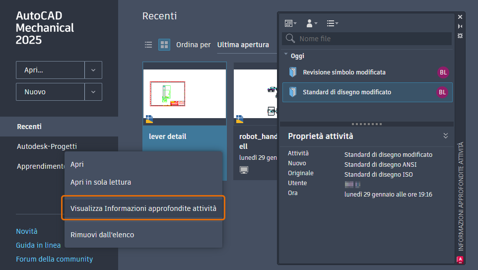 In AutoCAD Mechanical 2025, Informazioni approfondite attività ora registra più attività e fornisce informazioni più dettagliate sulle norme di disegno e sulle revisioni di simboli.