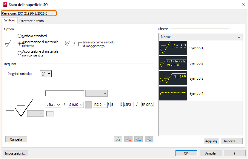 Il simbolo di stato della superficie ora supporta le revisioni più recenti degli standard ISO (ISO 21920-1:2021(E)) e ANSI/ASME (ASME Y14.36 - 2018).