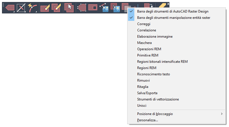 Per visualizzare un menu di tutte le barre degli strumenti disponibili, fare clic con il pulsante destro del mouse su una barra degli strumenti visibile di AutoCAD Raster Design. È quindi possibile visualizzare qualsiasi altra barra degli strumenti elencata nel menu di scelta rapida.