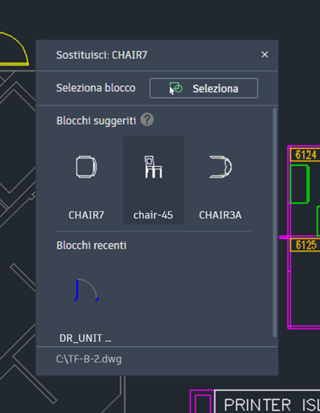 SOSTITUISCIB: sostituisce i riferimenti di blocco specificati con un blocco selezionato da un elenco di blocchi suggeriti.