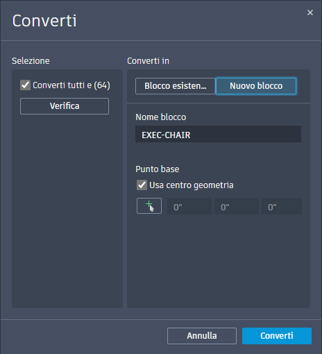 CONVERTIB: apre la finestra di dialogo Converti e converte in blocchi la geometria selezionata e le istanze identiche.