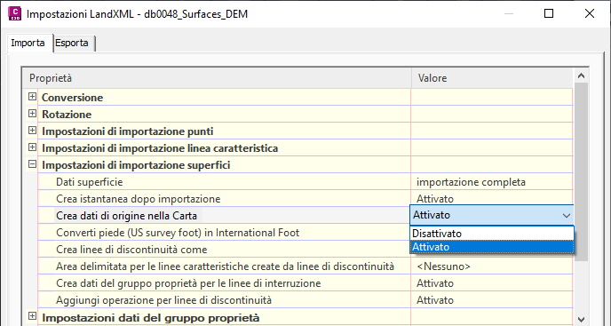 Figura 2: Impostazioni LandXML per l'importazione delle superfici