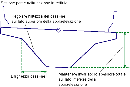 Il componente sezione tipo costruisce i collegamenti per l'impalcato del ponte e la sottostruttura in base ai parametri di input specificati. Nel corso della sopraelevazione, non viene ruotata tutta la struttura. Il valore di spessore totale viene mantenuto a partire dall'estradosso superiore dell'impalcato sul lato basso del ponte e l'altezza del cassone viene regolata sul lato alto sulla base dell'impalcato.