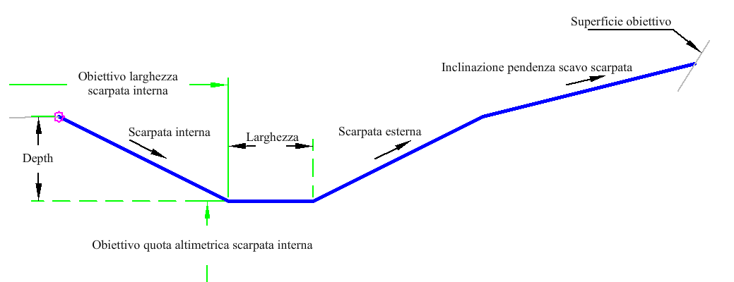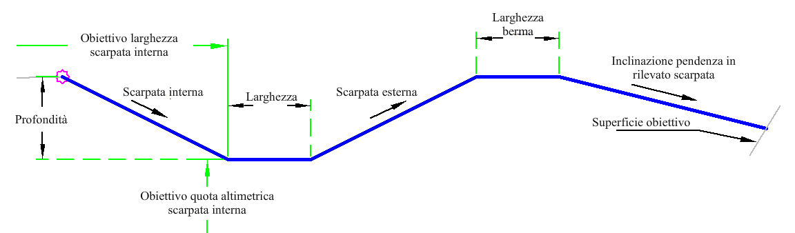 Vengono creati la scarpata interna, il fondo e la scarpata esterna del fosso. Viene quindi determinato il componente sezione tipo in scavo o in rilevato in corrispondenza della parte superiore della scarpata esterna. In condizione di rilevato, viene creata una berma e quindi la scarpata. In condizione di scavo, viene creato il collegamento di scarpata mediante la pendenza della scarpata.