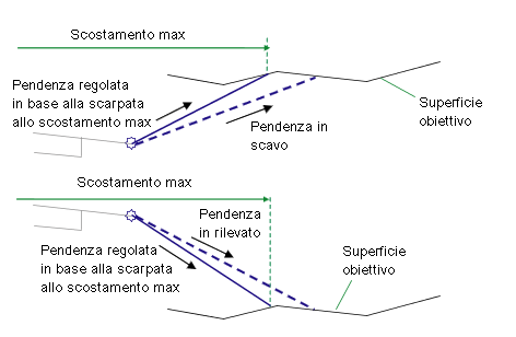Se necessario, la pendenza viene regolata per mantenere il punto di fine scarpata entro uno scostamento +/- massimo dalla linea base.