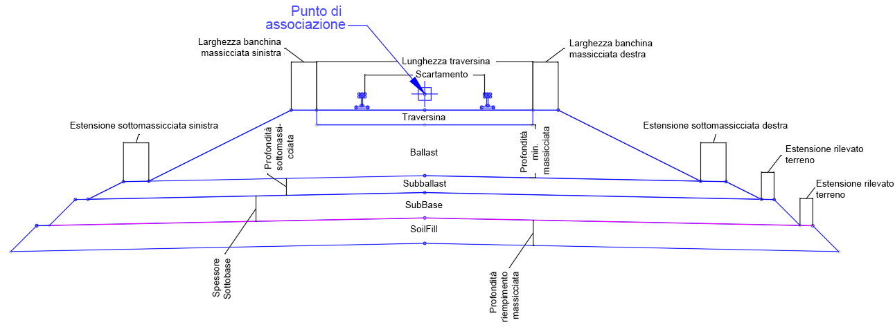 In modalità layout questo componente sezione tipo visualizza i collegamenti comprendenti le rotaie, le traversine, la massicciata, la sottomassicciata e le scarpate.