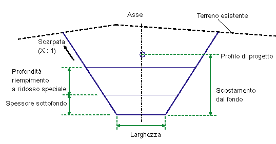 La quota altimetrica del fondo della trincea viene calcolata alla quota altimetrica di profilo del progetto meno il valore Scostamento dal fondo. Il collegamento del fondo della trincea orizzontale viene collocato simmetricamente all'incirca allo scostamento del punto di associazione a quella quota altimetrica, mentre le scarpate si estendono verso l'alto fino alla superficie esistente. Il collegamento orizzontale di sottofondo viene collocato allo spessore specificato sopra il fondo della trincea. Il collegamento orizzontale di riempimento speciale viene collocato allo spessore specificato sopra il collegamento di sottofondo.