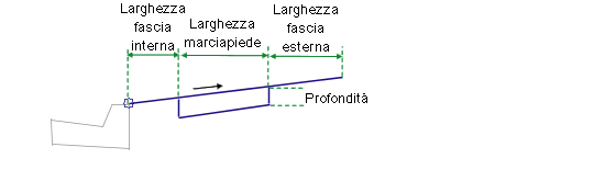 I collegamenti della fascia erbosa interna, del marciapiede e della fascia erbosa esterna vengono inseriti verso l'esterno dal punto di associazione secondo la pendenza specificata. Le fasce erbose possono essere omesse specificando un valore di larghezza uguale a zero.