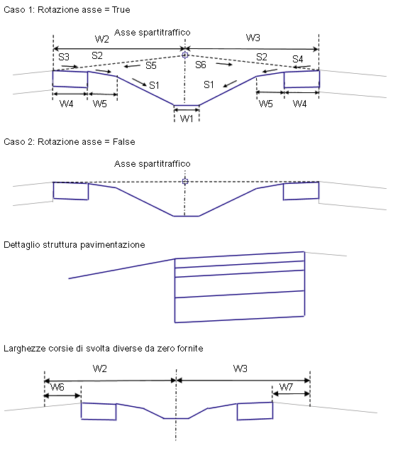 Consente di scegliere se la quota del profilo e il punto di perno devono trovarsi in corrispondenza dell'asse sopra il fosso dello spartitraffico, oppure se devono essere mantenuti sui cigli interni delle corsie |