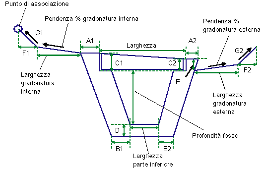 | Pendenza % gradonatura interna | Pendenza % trasversale della gradonatura interna facoltativa. Viene misurata a partire dal bordo della struttura di fosso e una pendenza positiva indica l'innalzamento della gradonatura dal fosso. | Numerico, Tipo pendenza % | 4% |