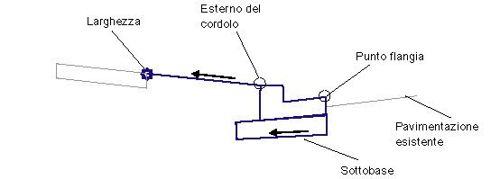 Consente il posizionamento di cordolo e cunetta. È possibile utilizzare i seguenti tipi di oggetto come obiettivi per la specificazione della quota altimetrica: profili, polilinee 3D, linee caratteristiche o figure di rilievo. |