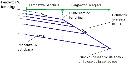 | Tipo scarpata sottobase | Selezionare se mantenere il collegamento di scarpata su una pendenza fissa con larghezza variabile, oppure se mantenerlo ad una larghezza fissa con pendenza variabile | Elenco di selezione: a) Mantieni pendenza, regola larghezza, b) Mantieni larghezza, regola pendenza | Mantieni pendenza, regola larghezza |