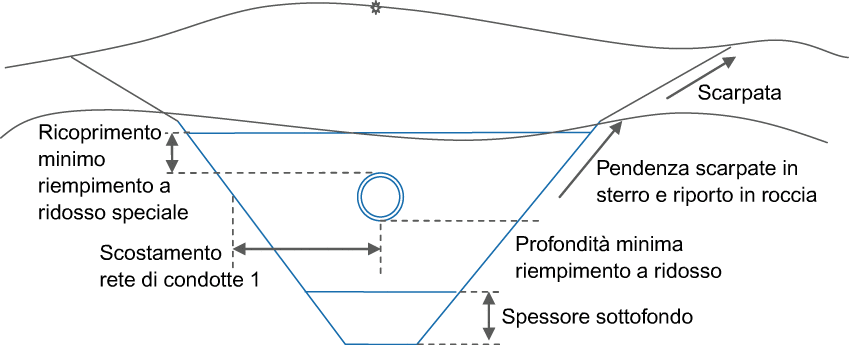 In entrambi i casi il componente sezione tipo determinerà il fondo della profondità della trincea e la larghezza della trincea in base alla posizione di una o più condotte in reti di condotte specificate. Il ricoprimento minimo riempimento speciale viene determinato dal diametro superiore esterno della condotta più alta trovata nella sezione campionata. Lo spessore minimo riempimento speciale viene determinato dal diametro inferiore esterno della condotta più bassa trovata nella progressiva campionata. A seconda della superficie al di sotto della quale si trovano i lati della scarpata, viene utilizzata la pendenza appropriata (rocciosa o regolare).