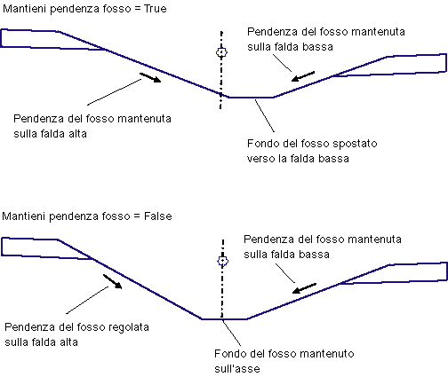 Le sopraelevazioni o le corsie di svolta possono rendere asimmetrico un fosso in quanto il lato destro e sinistro della sommità delle pendenze del fosso possono trovarsi a quote altimetriche differenti. Per risolvere questa situazione sono disponibili due alternative. Se Mantieni pendenza fosso è impostato su True, le pendenze di fosso specificate sono mantenute costanti su entrambi i lati, e il fondo del fosso risulta spostato dall'asse verso il lato inferiore. Se è impostato su False, il fondo del fosso risulta centrato sull'asse dello spartitraffico, la pendenza specificata sul lato inferiore viene mantenuta mentre quella sul lato superiore viene regolata.