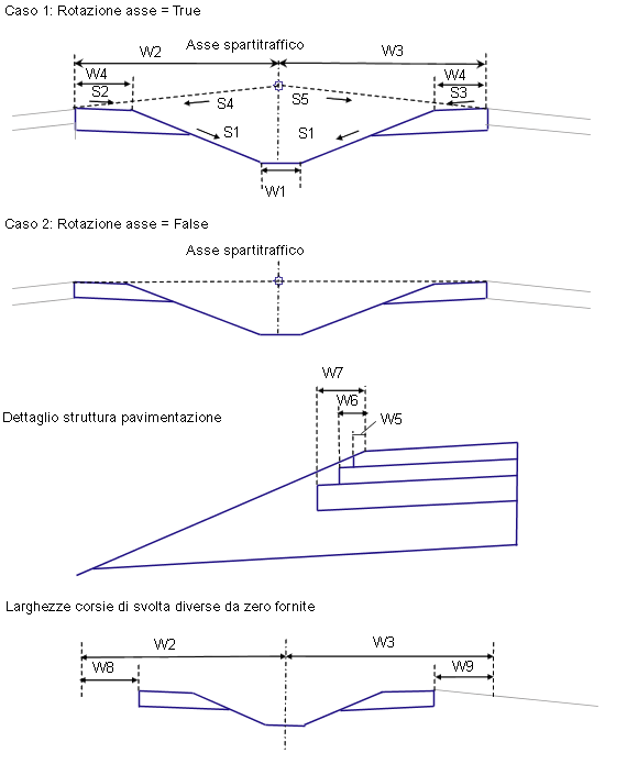 Consente di scegliere se la quota del profilo e il punto di perno devono trovarsi in corrispondenza dell'asse sopra il fosso dello spartitraffico, oppure se devono essere mantenuti sui cigli interni delle corsie |