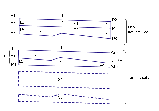 Collegamenti di ricoprimento. Si noti che L3, L4 vanno dalla parte inferiore alla sommità del ricoprimento, in entrambi i casi di fresatura e livellamento. |