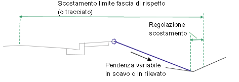 Valore +/- aggiunto allo Scostamento limite fascia di rispetto. Un valore di regolazione negativo sposta il punto di fine scarpata all'interno del limite della fascia di rispetto. Un valore positivo lo sposta all'esterno del limite della fascia di rispetto. |