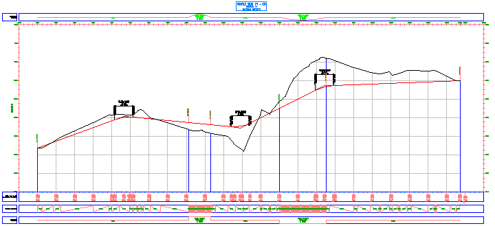 La finca dati all'inizio della vista profilo PV - (3) mostra le posizioni di curve orizzontali nel tracciato principale. Linee verticali blu attraversano la maglia della vista profilo per contrassegnare l'inizio e la fine di ogni curva orizzontale. La finca dati nella parte inferiore annota la quota altimetrica di entrambi profili alle progressive principali.
