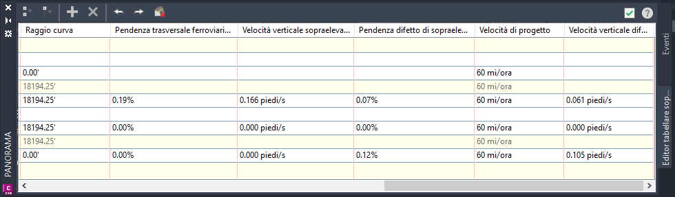 Per ulteriori informazioni, vedere la Finestra di dialogo Editor tabellare sopraelevazione ferroviaria.