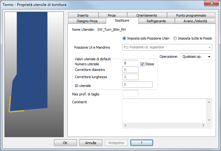 Operazioni — Selezionare una voce nell'elenco per specificare il tipo di operazione per cui FeatureCAM può selezionare questo utensile. Si possono sostituire queste impostazioni selezionando l'utensile manualmente.