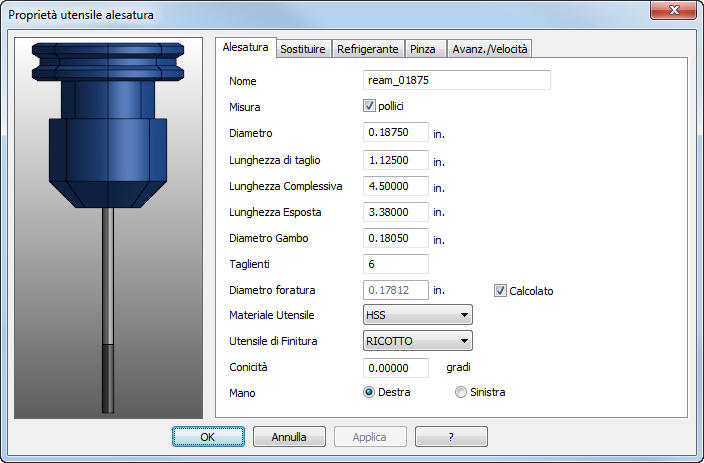 Direzione — Impostare se l'utensile è Destrorso o Sinistrorso.