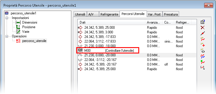 Per esempio, si può inserire uno stop condizionale M00 in un punto particolare per poter controllare l'utensile.