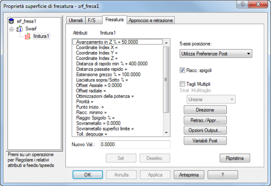 Sovrametallo finitura — Inserire la quantità di materiale da lasciare dopo una passata di finitura. Si può inserire un valore positivo o negativo. Si può inserire un numero negativo, fino al valore negativo del raggio dell'utensile, per permettere la riduzione del volume o lo spazio della scintilla, e la parte è lavorata in superfici, del valore negativo specificato. Se non viene impostato alcun valore, il Sovrametallo è come impostazione predefinita uguale a 0.