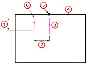 La Troncatura taglia la parte del contorno lasciata dall'opzione di retrazione. La lavorazione è nella direzione inversa della curva di lavorazione, dal punto finale del contorno alla posizione di stop. L'elettroerosione si interrompe prima di allontanarsi dalla parte. La posizione di stop è mostrata come un piccolo quadrato.