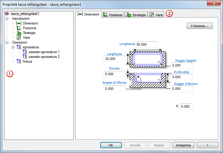 La vista ad albero visualizza un elenco delle operazioni e delle passate per la feature. Le schede visualizzate nella finestra di dialogo cambiano in base al livello selezionato nella vista ad albero.