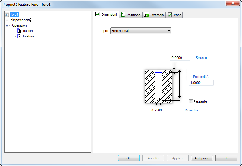 Diametro — Inserire il diametro del foro o fare clic sull'etichetta blu per selezionarlo nella finestra grafica.